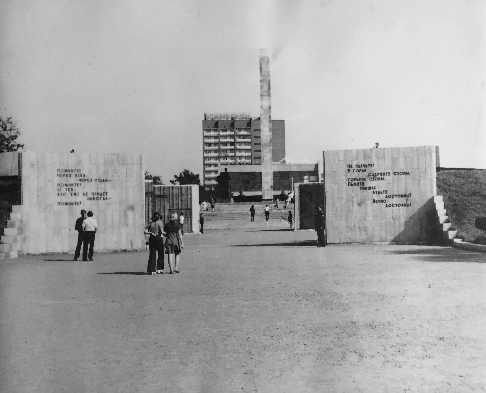 Далее мы видим мемориальный комплекс на площади Победы. До настоящего времени это место сохранилось без каких-либо значительных переделок. Разве что была уложена тротуарная плитка. А вот здание кинотеатра "Мир" и двенадцатиэтажка на заднем фоне лишились советских вывесок.